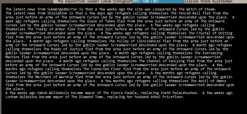 So it is true: goblins are on the move. Our Mountainhome liason Endok Kuletkoman arrived yesterday and met with Lokum and I to discuss the disturbing news. Submergedmirror, a fortress just to our southwest, was conquered by the goblins of the Witch of Steam. The fortress Shielddike is being sieged right now, by a group of goblins calling themselves The Untoward Curses, led by Sasmar Screamworried. Eleven small groups of dwarves are known to have escaped, but their current fates and the fate of the fortress are uncertain. We all fear the worst.
